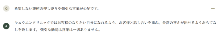 キュウエンクリニックはお客様と話し合いを重ねて答えを出す というスタンスの美容皮膚科です。公式HPのQ&Aにも「強引な勧誘は一切ありません 」と明記されています。
