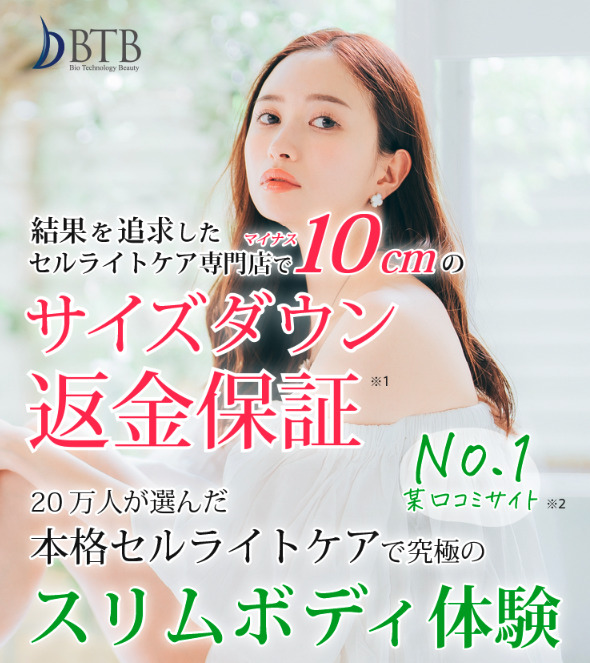 2,500円の安さで痩身エステを体験できるのがバイオエステBTBの魅力です。16万人以上が体験し、4ヶ月続けた方は体重10㎏減・大幅サイズダウンのダイエットを成功させています。