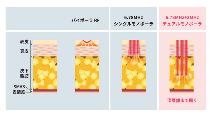 | 熱の種類 | 高周波(モノポーラ2種) | 高密度焦点式超音波(HIFU) | 高周波(モノポーラ) | 高周波(モノポーラ) |